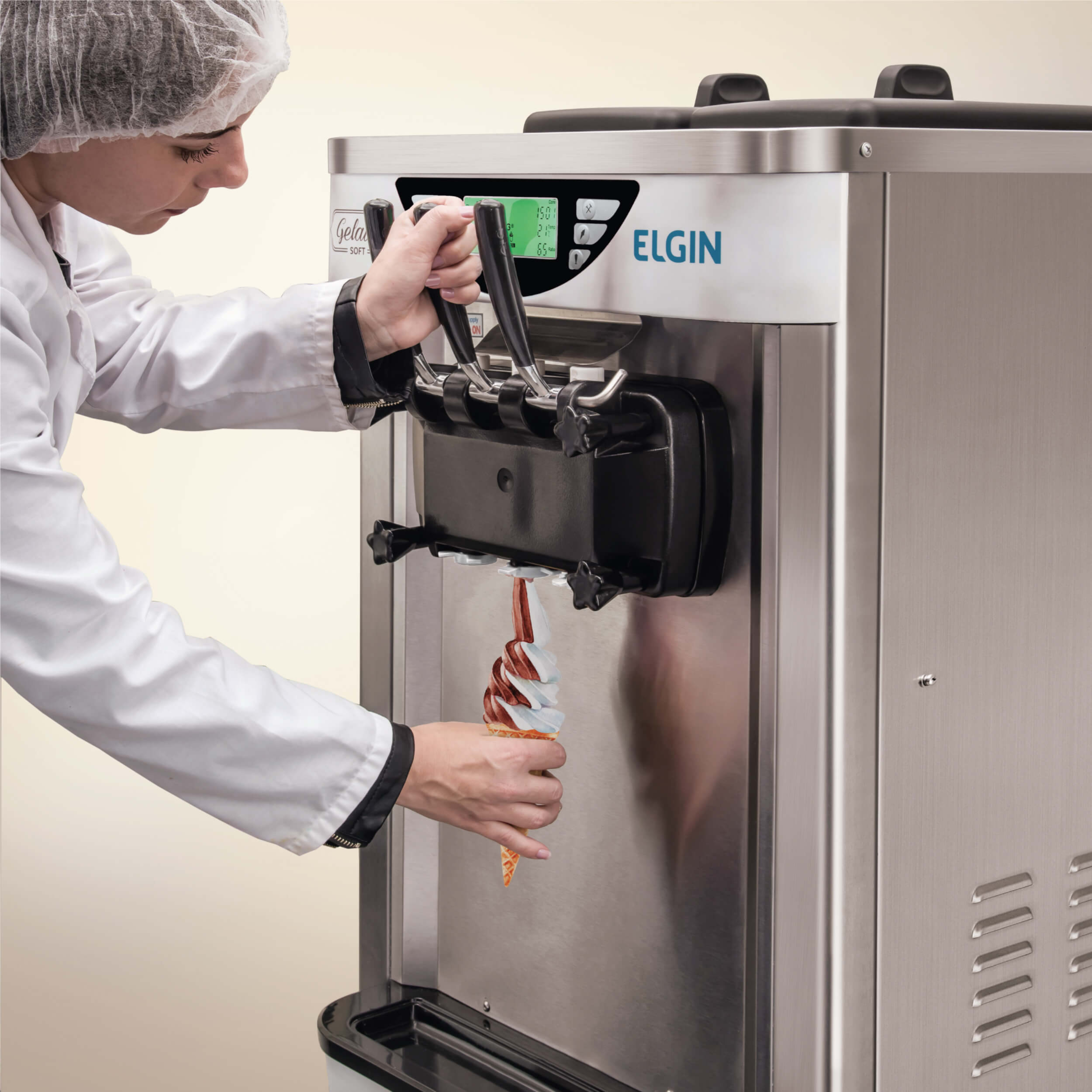 O equipamento possui dois sistemas de refrigeração independentes, um para os cilindros e outro para as cubas que permite a conservação da calda no modo noturno.
