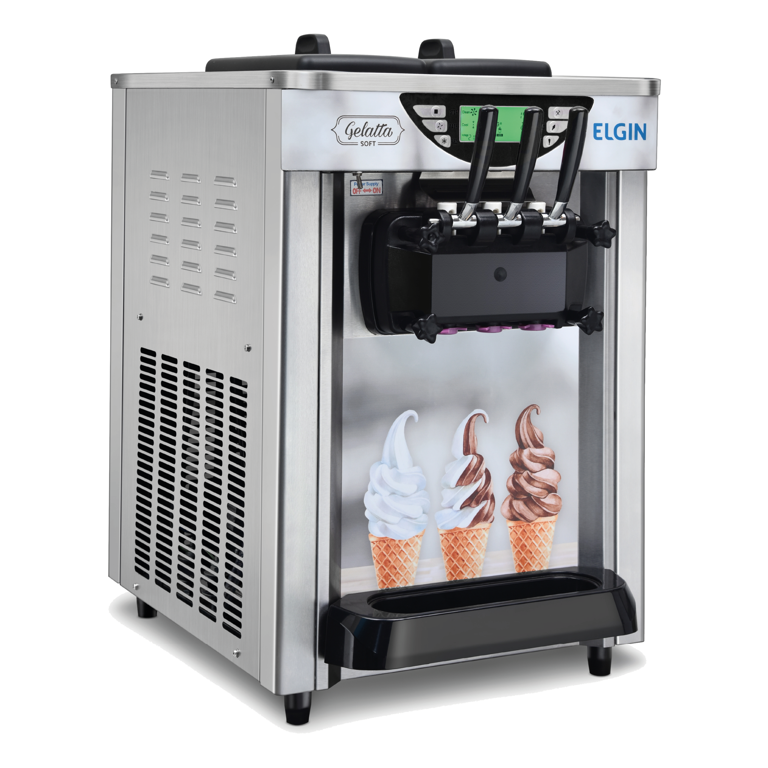 O painel digital conta com contador de sorvetes, indicador de tensão elétrica, indicador de falhas e as funções produção, limpeza e ajuste da consistência do sorvete.